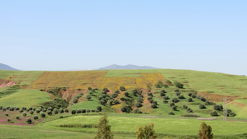 - das leuchtende Grün der Wiesen mit dem Rot von Mohnfeldern um die