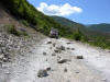 links Richtung Zenisht ab. Die ehemalige Teerstraße weist große Löcher