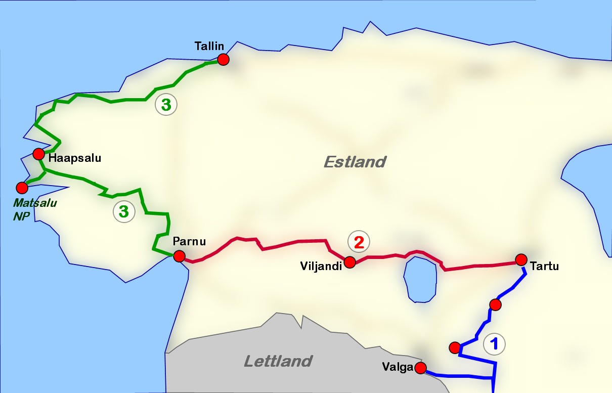 Pärnu - Audru - Lavassaare - Kirbla - Parila - Matsalu NP - Haapsalu - Taebla - Riguldi - Nova - Rummu - Keila - Tallin |