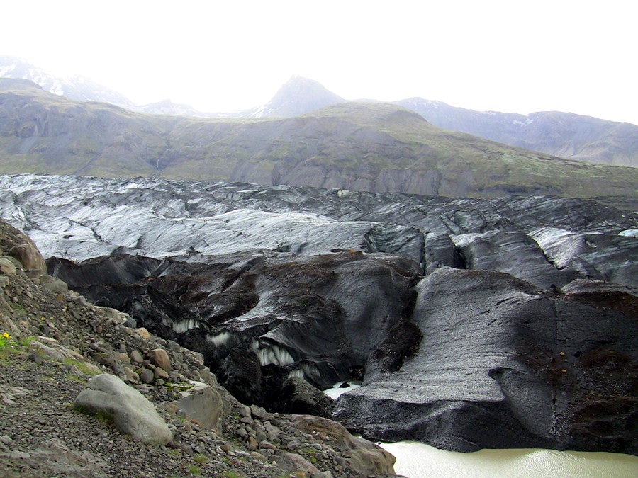 tiefschwarze, wild zerklüftete Gletscheroberfläche.