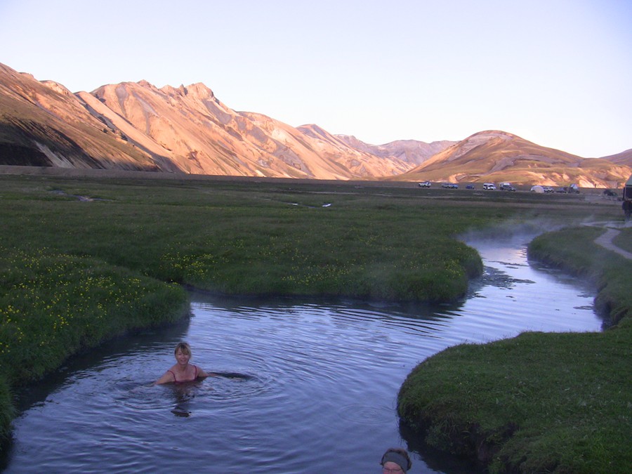 Der Weg endet auf einer mit vielen kleinen Bächen durchzogenen Grasebene, auf der reger Betrieb herrscht. Hauptanziehungspunkte sind die Stellen im Bach, wo sich im heißen Wasser Badegelegenheiten ergeben. Es gibt eine Plattform, auf der man sich umziehen kann. Das Badevergnügen ist eher durchwachsen, weil sich die heißen Quellen sehr schnell mit kaltem Wasser durchmischen. Leider hat sich in den letzten Jahren durch den immensen Publikumsverkehr eine Algenplage entwickelt, die das Badevergnügen etwas einschränkt. Es gibt bereits Warnhinweise auf mögliche allergische Reaktionen.